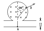 4、计算题 如图所示,圆形区域的半径为R,内有垂直纸面向里的匀强磁场,磁感强度为B,磁场下面有竖直方向的匀强电场。一质量为m、电量为 q的粒子(重力不计),粒子由静止开始从A运动到B,速度方向偏转了600。问: