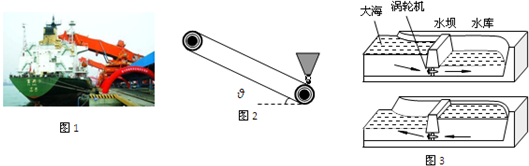 (2)图3为潮汐发电的示意图.左侧是大海,中间有水坝,水坝下装有发电机,右侧是水库.当涨潮到海平面最高时开闸,水由通道进入海湾水库,发电机在水流的推动下发电,待库内水面升至最高点时关闭闸门;当落潮到海平面最低时,开闸放水发电.设某潮汐发电站发电有效库容V=3.6×106m3,平均潮差△h=4.8m,一天涨落潮两次,发电四次.水流发电的效率η1=10%.求该电站一天内利用潮汐发电的平均功率P;
