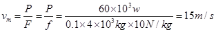 4、填空题 汽车的质量为m=6.0×103kg,额定功率为Pe=90kW,沿水平道路行驶时,阻力恒为重力的0.05倍,g取10m/s2,则: