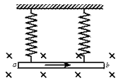 3、计算题 如图所示,在两根劲度系数都为k的相同的轻质弹簧下悬挂有一根导体棒ab,导体棒置于水平方向的匀强磁场中,且与磁场垂直。磁场方向垂直纸面向里,当导体棒中通以自左向右的恒定电流时,两弹簧各伸长了;若只将电流反向而保持其他条件不变,则两弹簧各伸长了