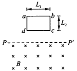 3、计算题 如图所示,矩形单匝导线框abcd竖直放置,其下方有一磁感应强度为B的有界匀强磁场区域,该区域的上边界PP"水平,并与线框的ab边平行,磁场方向与线框平面垂直。已知线框ab边长为L1, ad边长为L2,线框质量为m,总电阻为R。现无初速度地释放线框,在下落过程中线框所在平面始终与磁场垂直,且线框的ab边始终与PP"平行。重力加速度为g,若线框恰好匀速进入磁场,求: