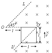 如图所示,LOO"L"为一折线,它所形成的两个角∠LOO"和∠OO"L"均为45°。折线的右边有一匀强磁场,其方向垂直于纸面向里,一边长为l的正方形导线框沿垂直于OO"的方向以速度v作匀速直线运动,在t=0的刻恰好位于图中所示位置。以逆时针方向为导线框中电流的正方向,在下面四幅图中能够正确表示电流-时间(I-t)关系的是(时间以l/v为单位)