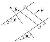 4、选择题  如图所示,平行且足够长的两条光滑金属导轨,相距L=0.4 m,导轨所在平面与水平面的夹角为30°,其电阻不计.把完全相同的两金属棒(长度均为0.4 m)ab、cd分别垂直于导轨放置,并使每棒两端都与导轨良好接触.已知两金属棒的质量均为m=0.1 kg、电阻均为R=0.2 Ω,整个装置处在垂直于导轨平面向上的匀强磁场中,磁感应强度为B=0.5 T,当金属棒ab在平行于导轨向上的力F作用下沿导轨向上匀速运动时,金属棒cd恰好能保持静止.(g=10 m/s2),则
