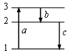 5、选择题 如图是氢原子第1、2、3能级的示意图。处于基态的氢原子吸收了一个光子a后,从基态跃迁到第3能级;然后该氢原子自发地放出一个光子b后,由第3能级跃迁到第2能级;接着又自发地放出一个光子c后,由第2能级跃迁到第1能级。设a、b、c三个光子的频率依次为ν1、ν2、ν3,波长依次为λ1、λ2、λ3,下列说法中正确的是