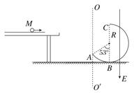3、计算题 一质量为m1=1 kg、带电量为q=0.5 C的小球M以速度v=4.5 m/s自光滑平台右端水平飞出,不计空气阻力,小球M飞离平台后由A点沿切线落入竖直光滑圆轨道ABC,圆轨道ABC的形状为半径R<4 m的圆截去了左上角127°的圆弧,CB为其竖直直径,在过A点的竖直线OO′的右边空间存在竖直向下的匀强电场,电场强度大小为E=10 V/m.(sin53°=0.8,cos53°=0.6,重力加速度g取10 m/s2)求: