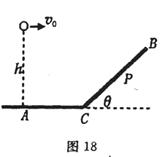 1、计算题 (10分)如图18所示,一个小球从高h=10m处以水平速度v0=10m/s抛出,撞在倾角θ=45°的斜面上的P点,已知AC=5m,求: