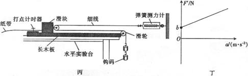 实验装置如图丙所示,一端装有定滑轮的、表面粗糙的长木板固定在水平实验台上,长木板上有一滑块,滑块右侧固定一轻小动滑轮,钩码和弹簧测力计通过绕在滑轮上的水平轻绳相连,放开钩码,滑块在长木板上做匀加速直线运动。