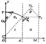 3、计算题 如图,在区域I(0≤x≤d)和区域II(d≤x≤2d)内分别存在匀强磁场,磁感应强度大小分别为B和2B,方向相反,且都垂直于Oxy平面。一质量为m、带电荷量q(q>0)的粒子a于某时刻从y轴上的P点射入区域I,其速度方向沿x轴正向。已知a在离开区域I时,速度方向与x轴正方向的夹角为30°;此时,另一质量和电荷量均与a相同的粒子b也从p点沿x轴正向射入区域I,其速度大小是a的1/3。不计重力和两粒子之间的相互作用力。求