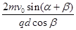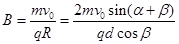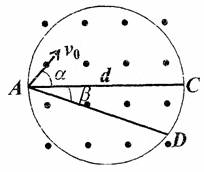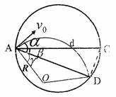 1、计算题 在直径为d的圆形区域内存在均匀磁场、磁场方向垂直于圆面指向纸外。一电量为q、质量的m的粒子,从磁场区域的一条直径AC上的A点射入磁场,其速度大小为v0,方向与AC成α角。若此粒子恰好能打在磁场区域圆周上的D点,AD与AC的夹角为β,如图所示,求该匀强磁场的磁感应强度B的大小。
