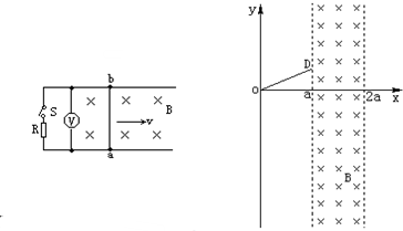 4、简答题 如图所示,坐标系xoy平面内的坐标原点O处有一粒子源,在某时刻发射大量质量为m、电荷量为q的带负电的粒子,它们的速度大小相同,速度方向均在xoy平面内.在直线x=a与x=2a之间存在垂直xoy平面向里的磁感应强度为B的匀强磁场,已知从坐标点D(a,