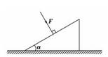 5、选择题 如图所示,力F垂直作用在倾角为α的三角滑块上,滑块没被推动,则滑块受到地面静摩擦力的大小及方向为