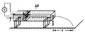 3、计算题 如图所示为利用电磁作用输送非导电液体装置的示意图。一边长为L、截面为正方形的塑料管道水平放置,其右端面上有一截面积为A的小喷口,喷口离地的高度为h。管道中有一绝缘活塞,在活塞的中部和上部分别嵌有两根金属棒A、B,其中棒B的两端与一电压表相连,整个装置放在竖直向上的匀强磁场中,当棒A中通有垂直纸面向里的恒定电流I时,活塞向右匀速推动液体从喷口水平射出,液体落地点离喷口的水平距离为S。若液体的密度为ρ,不计所有阻力,求: ?