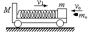 2、计算题 如图所示,光滑水平面上有一辆质量为M=1kg的小车,小车的上表面有一个质量为m=0.9kg的滑块,在滑块与小车的挡板间用轻弹簧相连接,滑块与小车上表面间的动摩擦因数为μ=0.2,整个系统一起以v1=10m/s的速度向右做匀速直线运动,此时弹簧长度恰好为原长。现在用一质量为m0=0.1kg的子弹,以v0=50m/s的速度向左射入滑块且不穿出,所用时间极短。当弹簧压缩到最短时,弹簧被锁定,测得此时弹簧的压缩量为d=0.50m,g =10m/s2。求