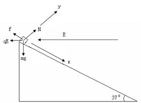 联立以上各式代数求解得:E=-10N/C,负号表明,电场强度实际方向与假设方向相反,即水平向右。(2分)