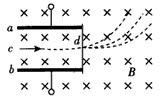 4、选择题 如图所示,a,b是一对平行金属板,分别接到直流电源两极上,右边有一挡板,正中间开有一小孔d,在较大空间范围内存在着匀强磁场,磁感强度大小为B,力向垂直纸面向里,在a、b两板间还存在着匀强电场E。从两板左侧中点c处射入一束正离子(不计重力),这些正离子都沿直线运动到右侧,从d孔射出后分成3束,则下列判断正确的是