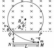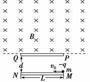 3、计算题 分如图所示,MN、PQ是平行金属板,板长为L,两板间距离为d,PQ板带正电,MN板带负电,在PQ板的上方有垂直纸面向里的匀强磁场.一个电荷量为q、质量为m的带负电粒子以速度v0从MN板边缘沿平行于板的方向射入两板间,结果粒子恰好从PQ板左边缘飞进磁场,然后又恰好从PQ板的右边缘飞进电场.不计粒子重力.试求: