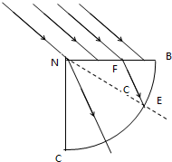 ,可得临界角C=45°,设BC界面上的临界点为E,此光线在NB界面上点F入射,在三角形NEB中可求得NE与水平方向的夹角为:180°-(120°+45°)=15°,所以E到B之间没有光线射出.由此可得没来源:91 考试网有光线射出的圆弧对应圆心角为 90°-(30°+15°)=45°=