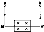 4、选择题 如图,一根有质量的金属棒MN,两端用细软导线连接后悬于a、b两点,棒的中部处于方向垂直纸面向里的匀强磁场中,棒中通有电流,方向从M流向N,此时悬线上有拉力,为了使拉力等于零,可以( )