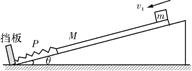 1、计算题 如图所示,斜面倾角为θ,在斜面底端垂直斜面固定一挡板,轻质弹簧一端固定在挡板上,质量为M=1.0 kg的木板与轻弹簧接触但不拴接,弹簧与斜面平行且为原长,在木板右上端放一质量为m=2. 0 kg的小金属块,金属块与木板间的动摩擦因数为μ1=0.75,木板与斜面粗糙部分间的动摩擦因数为μ2=0.25,系统处于静止状态.小金属块突然获得一个大小为v1=5.3 m/s、方向平行斜面向下的速度,沿木板向下运动.当弹簧被压缩x=0.5 m到P点时,金属块与木板刚好达到相对静止,且此后运动过程中,两者一直没有发生相对运动.设金属块从开始运动到与木块达到相同速度共用时间t=0.75 s,之后木板压缩弹簧至最短,然后木板向上运动,弹簧弹开木板,弹簧始终处于弹性限度内,已知sin θ=0.28、cos θ=0.96,g取10 m/s2,结果保留二位有效数字.