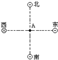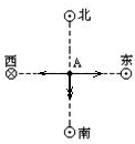 3、选择题 如图所示,在A点的东、西、南、北方向相同距离处,各有一无限长直线电流,电流大小相同,方向如图,则A点的磁场方向为( )