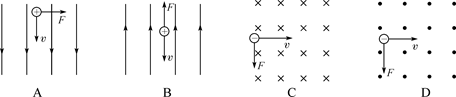 本题解析:A、B选项中粒子速度方向与磁场方向一致,不受力,A、B错误;根据左手定则,C正确、D错误。