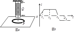 5、选择题 如图所示,圆形线圈P静止在水平桌面上,其正上方悬挂另一个线圈Q,P与Q共轴,Q中通有变化电流,电流随时间变化的规律如图b所示,P所受的重力为G,桌面对P的支持力为N,则(?)
