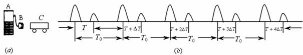 现固定装置B,并将它对准匀速行驶的小车C,使其每隔固定时间T0发射一短促的超声波脉冲,如图(b)中幅度较大的波形,反射波滞后的时间已在图中标出,其中T和△T为已知量,另外还知道该测定条件下超声波在空气中的速度为v0,根据所给信息求小车的运动方向和速度大小。