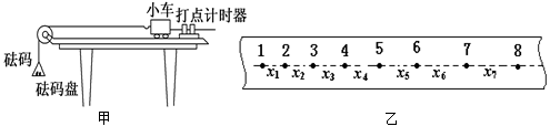 (1)某同学在平衡小车与桌面之间摩擦力的过程中,打出了一条纸带如图乙所示.计时器打点的周期为T.从比较清晰的点起,每5个点取一个计数点,标上1、2、3、4、5、6、7、8,测量并计算出的相邻计数点之间的距离如下表:
