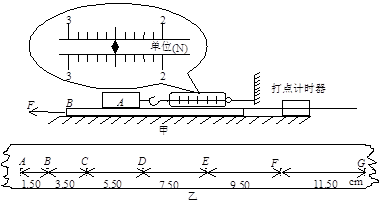 2、实验题 (6分)在一次课外活动中,某同学用图甲所示装置测量放在水平光滑桌面上铁块A与金属板B间的动摩擦因数。已知铁块A的质量mA="0.5" kg,金属板B的质量mB="1" kg。用水平力F向左拉金属板B,使其一直向左运动,稳定后弹簧秤示数的放大情况如图甲所示,则A、B间的摩擦力Ff=______N,A、B间的动摩擦因数μ=?。(g取10 m/s2)。该同学还将纸带连接在金属板B的后面,通过打点计时器连续打下一系列的点,测量结果如图乙所示,图中各计数点间的时间间隔为0.1 s,可求得拉金属板的水平力F=?N