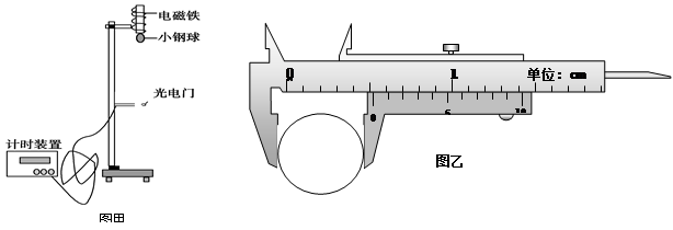 ①如图乙所示,用游标卡尺可测得小钢球的直径:d=?cm;实验时将小钢球从图示位置由静止释放,由数字计时器读出小球通过光电门的时间Δt=1.2×10-2s,则小球经过光电门时的瞬时速度为?m/s(保留2位有效数字)。