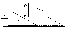 小木块P用细线拴在O点处,另一个三角形木块Q放在光滑水平面上,用水平外力F从左向右推动Q,使它作匀速直线运动,直到细线与斜面平行为止,如图所示。在这段过程中,P在竖直面内做圆周运动,P与斜面间的摩擦不能忽略。下面的说法中正确的是 ( )