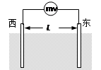 1、选择题 北半球海洋某处,地磁场水平分量B1=0.8×10-4T,竖直分量B2=0.5×10-4T,海水向南流动。海洋工作者测量海水的流速时,将两极板竖直插入此处海水中,保持两极板正对且垂线沿东西方向,两极板相距L=10m,如图所示。与两极板相连的电压表(可看作理想电压表)示数为U=0.2mV,则