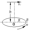 4、计算题 如图所示,半径为R的圆板匀速转动,当半径OB转动到某一方向时,在圆板中心正上方高h处以平行OB方向水平抛出一小球,要使小球与圆板只碰撞一次,且落点为B,求: