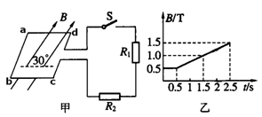 2、填空题 (18分)(1)如图所示,在匀强磁场中,与磁感应强度B成30°角放置一矩形线圈,共100匝,线圈长lab=10cm、宽lbc=8cm,线圈电阻r=1.0Ω,与它相连的电路中,电阻R1=4.0Ω,R2=5.0Ω,磁感应强度变化如图乙所示,开关闭合后t=1.5s时R2中电流的大小为_______A,此时左侧边ab所受的安培力大小_______N。