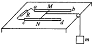 5、选择题 如图所示,相距为L的光滑平行金属导轨ab、cd放置在水平桌面上,阻值为R的电阻与导轨的两端a、c相连。滑杆MN质量为m,垂直于导轨并可在导轨上自由滑动,不计导轨、滑杆以及导线的电阻。整个装置放于竖直方向的范围足够大的匀强磁场中,磁感应强度的大小为B。滑杆的中点系一不可伸长的轻绳,绳绕过固定在桌边的光滑轻滑轮后,与另一质量也为m的物块相连,绳处于拉直状态。现将物块由静止释放,当物块达到最大速度时,物块的下落高度
