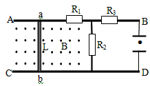 3、计算题 在竖直面内有两平行金属导轨AB、CD,间距为L,金属棒ab可在导轨上无摩擦地滑动棒与导轨垂直,并接触良好。它们的电阻均可不计。导轨之间有垂直纸面向外的匀强磁场,磁感强度为B。导轨右边与电路连接。电路中的三个定值电阻R1、R2、R3阻值分别为2R、R和0.5R。在BD间接有一水平放置的平行板电容器C,极板间距离为d。