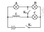 5、选择题 如图所示,A、B、C为三只相同的灯泡,且灯泡的额定电压均大于电源电动势,电源内阻不计,L是一个直流电阻不计、自感系数较大的线圈,先将K1、K2合上,稳定后突然断开K2。已知在此后过程中各灯均无损坏,则以下说法中正确的是