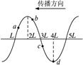 2、选择题 如图所示为一列简谐横波在t时刻的波形图,箭头表示波的传播方向,该列波的波速大小为v,波长λ=4L,a、b、c、d是介质中4个质量相等的振动质元.由此可知(?)