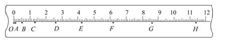 4、实验题 某兴趣小组的同学们在做 “用打点计时器测速度”的实验,让重锤自由下落,打出的一条纸带如图所示,图中直尺的单位为cm,点O为纸带上记录到的第一点,点A、B、C、D……依次表示点O以后连续的各点。已知打点计时器每隔 T =" 0.02" s 打一个点。