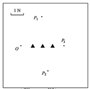 (1)实验记录纸如题图所示,O点为橡皮筋被拉伸后伸长到的位置,两弹簧测力计共同作用时,拉力F1和F2的方向分别过P1和P2点;一个弹簧测力计拉橡皮筋时,拉力F3的方向过P3点。三个力的大小分别为:F1=3.30 N、F2=3.85 N和F3=4.25 N。请根据图中给出的标度作图求出F1和F2的合力。