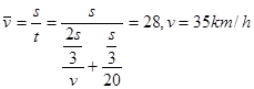 4、选择题  一辆汽车在平直公路上朝某个城市行驶,以速度v行驶了2/3的路程,接着以20 km/h的速度跑完了余下的路程,若全程的平均速度是28 km/h,则v是(? )