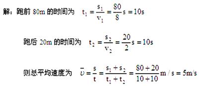 1、计算题 (8分)某运动员在百米跑道上以8m/s的速度跑了80m,然后又以2m/s的速度走了20m,这个运动员通过这段路的平均速度是多少?