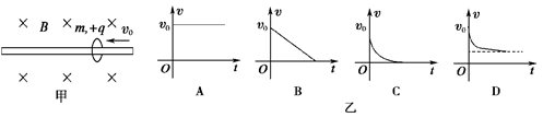 4、选择题 如图所示为一个质量为m、带电荷量为+q的圆环,可在水平放置的足够长的粗糙细杆上滑动,细杆于磁感应强度为B的匀强磁场中。现给圆环向左的初速度v0,在以后的运动过程中,圆环运动的速度—时间图象可能是图乙中的( )