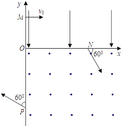5、简答题 平面直角坐标系xOy中,第1象限存在沿y轴负方向的匀强电场,第Ⅳ象限存在垂直于坐标平面向外的匀强磁场,磁感应强度大小为B.一质量为m、电荷量为q的带正电的粒子从y轴正半轴上的M点以速度v0垂直于y轴射入电场,经x轴上的N点与x轴正方向成60°角射入磁场,最后从y轴负半轴上的P点与y轴正方向成600角射出磁场,如图所示.不计粒子重力,求