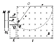 如图所示,MN为正对着竖直放置的金属板,其中N板的正中央有一个小孔,MN板间的电压U1 = 1.0×103 V.PQ为正对着水平放置的金属板,板长L =" 10" cm,两板间的距离d =" 12" cm,两板间的电压U2 =" 2.4" × 103 V.PQ板的右侧存在方向垂直纸面向里的匀强磁场区域,其中虚线为磁场的左右边界,边界之间的距离l =" 60" cm,竖直方向磁场足够宽.一个比荷= 5.0×104 C/kg的带正电粒子,从静止开始经MN板间的电压U1加速后,沿PQ板间的中心线进入PQ间,并最终进入磁场区域.整个装置处于真空中,不计重力影响.