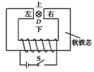 4、选择题 图中的D为置于电磁铁两极间的一段通电直导线,电流方向垂直于纸面向里。在开关S接通后,导线D所受磁场力的方向是