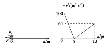 2、选择题 如图所示,物块的质量m=1 kg,初速度v0=10 m/s,在一水平向左的恒力F作用下从O点沿粗糙的水平面向右运动,某时刻后恒力F突然反向,整个过程中物块速度的平方随位置坐标变化的关系图象如图所示,g=10 m/s2.下列选项中正确的是? ( ).