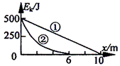 1、选择题 将电动车的前轮装有发电机,发电机蓄电池连接。当在骑车者用力蹬车或电动自行车自动滑行时,自行车就可以连通发电机向蓄电池充电,将其他形式的能转化成电能储存起来。现有某人骑车以500J的初动能在粗糙的水平路面上滑行,第一次关闭自充电装置,让车自由滑行,其动能随位移变化关系如图线①所示;第二次启动自充电装置,其动能随位移变化关系如图线②所示,则第二次向蓄电池所充的电能是