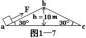 2、计算题 如图1—7所示,质量为20 kg的物体受到一个始终与路面平行的力F的作用,沿abc路径匀速地通过一座高为10 m的小山坡,物体与路面间的摩擦力始终为20 N。求作用力F将物体从a匀速地达到C所做的总功为多少?