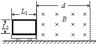 4、简答题 如图所示,水平面上有一个动力小车,在动力小车上竖直固定着一个长度L1、宽度L2的矩形线圈,线圈匝线为n,总电阻为R,小车和线圈的总质量为m,小车运动过程所受摩擦力为f.小车最初静止,线圈的右边刚好与宽为d(d>L1)的有界磁场的左边界重合.磁场方向与线圈平面垂直,磁感应强度为B.现控制动力小车牵引力的功率,让它以恒定加速度a进入磁场,线圈全部进入磁场后,开始做匀速直线运动,直至完全离开磁场,整个过程中,牵引力的总功为W.